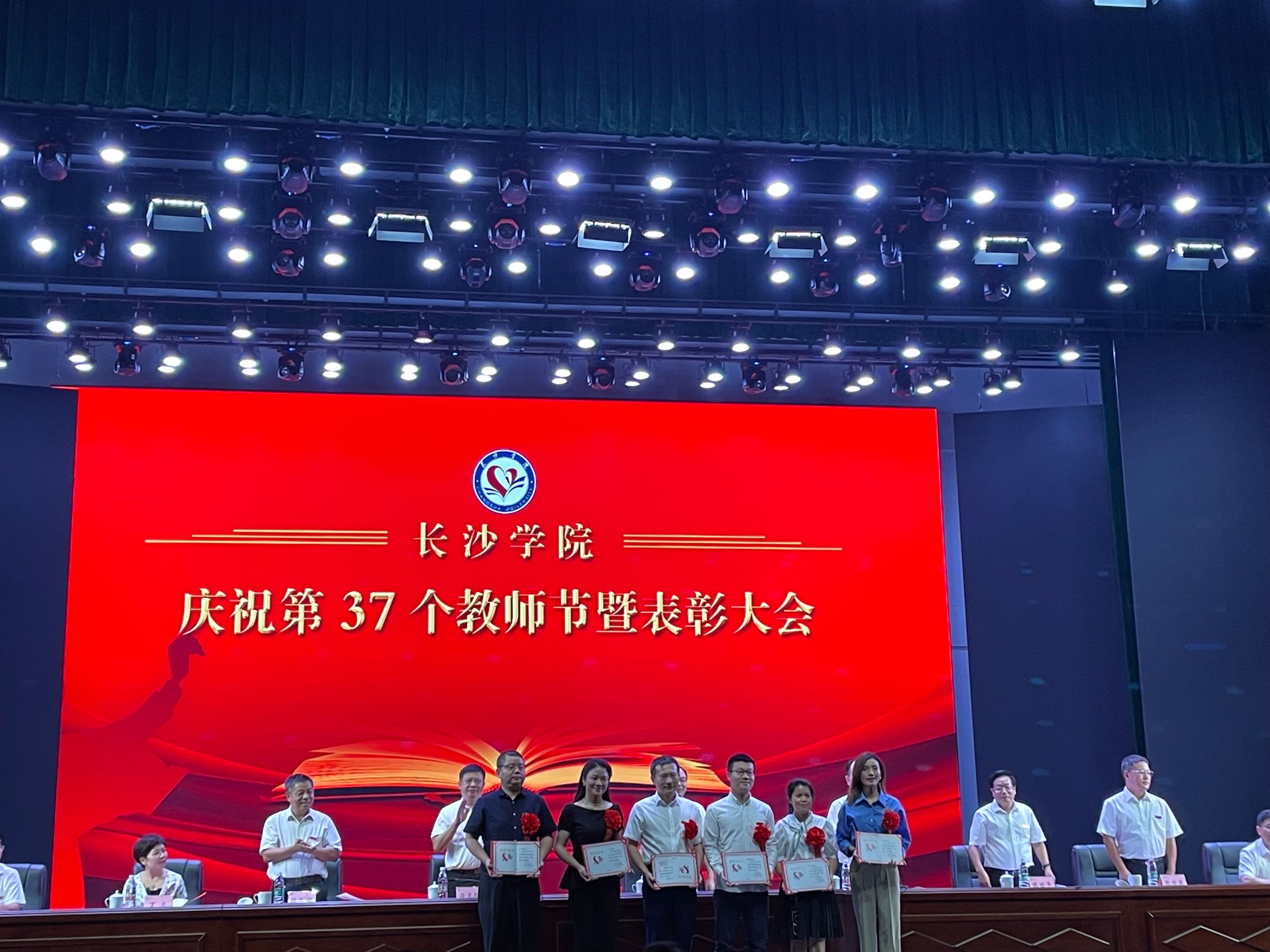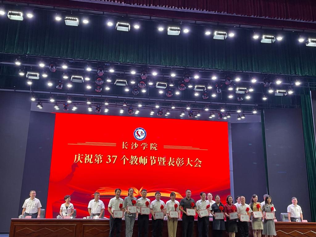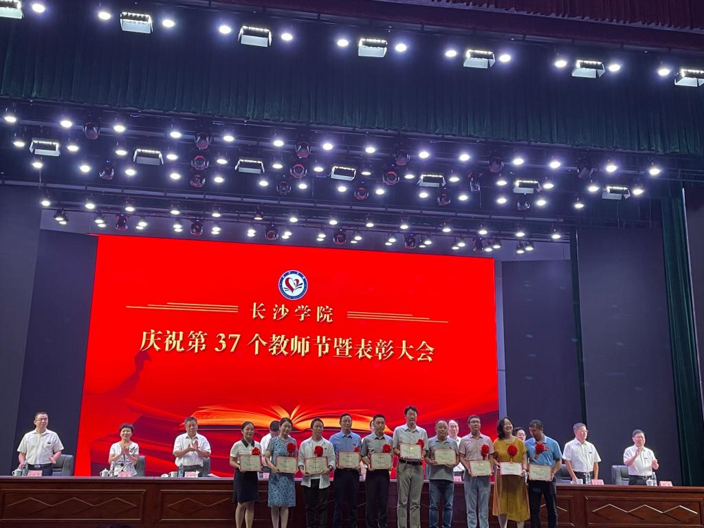 为庆祝第37个教师节,学校于9月9日下午在大礼堂隆重举行了教师节表彰大会,对教学、科研一线表现突出的教师进行了表彰。我院“湖南省科学技术进步奖一等奖获得者”张文娟副教授、“重大成果转化团队”吴鹏老师、“湖南省引进100个科技创新人才人选”杨波教授、“长沙学院师德标兵获得者”冯璐副教授,“我最喜爱的教师”刘亮、聂云志上台接受了颁奖。