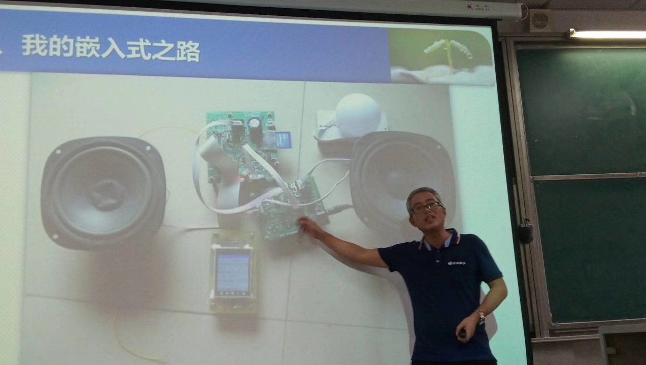 刘军先生首先讲述自己如何从一名电子草根爱好者、民间高手蜕变为创业者,并成为国内知名度极高的嵌入式开发平台供应商的成长经历,接着深入浅出地讲述嵌入式技术现状与发展趋势,然后结合自己撰写的十几本专业著作,详细分享了“真正以项目角度出发”学习嵌入式系统技术的方法。原子哥风趣、睿智的语言引得演讲现场掌声、笑声不断。