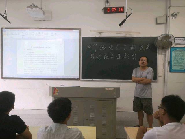 我校从长沙理工大学引进的左毅博士刚刚接任电气工程及其自动化专业教研室主任。他在新生专业教育中,首先结合自己的科研经历,详细讲述了电气专业所要学习的专业知识及其发展方向,然后系统的介绍了电气专业建设情况和师资情况,指导同学们根据自己的实际情况选择发展方向。今年新入职的于佳琪博士给同学们指出,“大学是一个新的起跑线”。她首先列举本专业向上发展的三条路径,又给出多个实例佐证,并且勉励同学们要吃得苦,努力充实大学四年的生活。