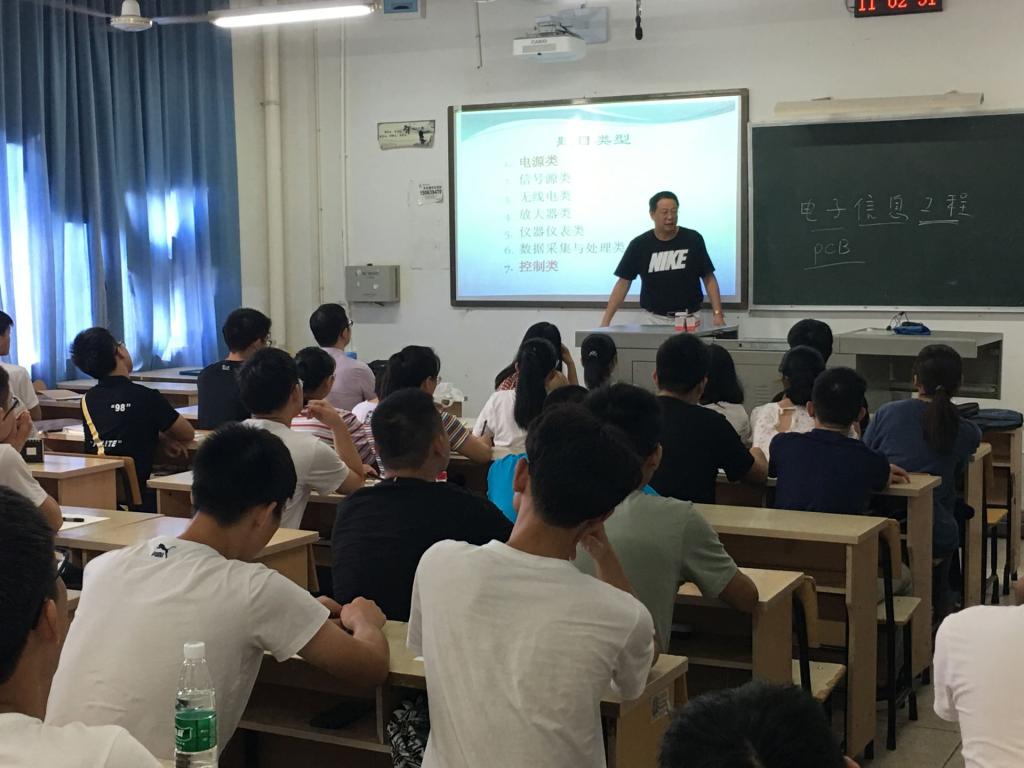 电子信息工程专业一直是我校参加大学生电子设计竞赛的生源“大户”,在刚刚落幕的2019年“TI”杯大学生电子设计竞赛中,16电子01班的刘蒙瑞率队勇夺国家二等奖。电子信息工程教研室“自然而然”把专业教育活动办成了“大学生电子设计竞赛动员会”。电信学院副院长刘辉教授结合大学生电赛命题新趋势剖析专业知识脉络,王新辉教授则向同学们指明电子信息学科重点和发展要求,教研室主任龙英博士给新生讲解作为一名优秀大学生所应该具有的品质。2017年“瑞萨杯”全国大学生电子设计竞赛国家一等奖队的指导教师吴了博士更是直接在现场开展竞赛宣传。