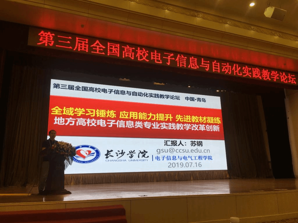 2019年7月14日至16日,“第三届全国高校电子信息与自动化实践教学论坛”在山东省青岛市召开,我校电子信息与电气工程学院苏钢教授应邀出席并做主题为“全域学习锤炼、应用能力提升、先进教材凝练--地方高校电子信息类专业实践教学改革创新”的专题报告。