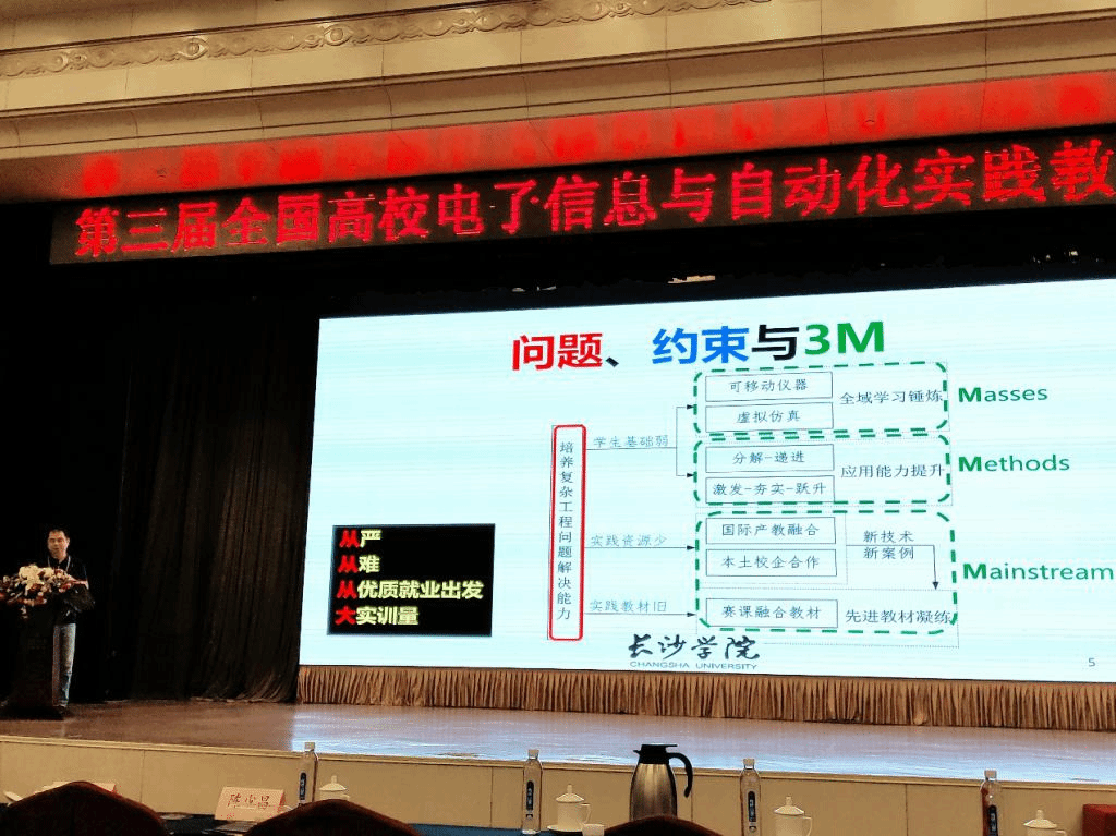 据悉,这是苏钢老师连续三届在该论坛做专题报告发言。2017年他分享了《数字电子技术》单门课程的理论、实验和课程设计的一体化整合方法,2018年他汇报的是模拟电路、数字系统和嵌入式系统的“大课程群”的贯通式构建思路。今年他的报告则是对标工程教育专业认证“复杂工程问题解决能力”培养要求,概述依托湖南省高校“双一流”应用特色学科建设促进“一流本科”专业建设的整体思路,全方位阐述了我校电子信息类专业实践教学的顶层设计、重构策略及系统性探索。