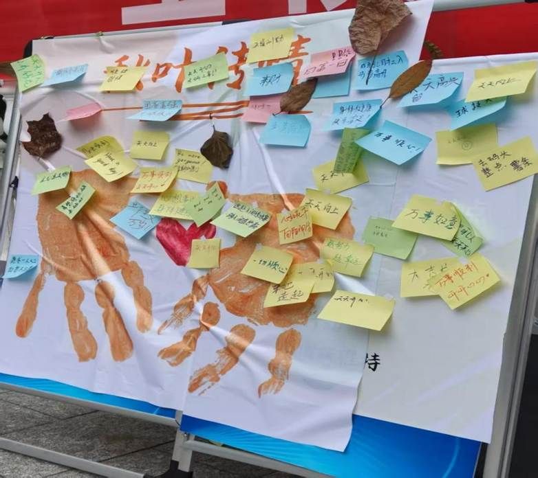秋叶传情环节则巧妙结合季节特色,以落叶为“信纸”,鼓励同学们写下对未来的期待与目标,并将其贴在环保心愿墙上。现场同步设置了目标设定与心理健康相关知识的科普展板,帮助同学们理解科学规划对个人成长的积极意义。