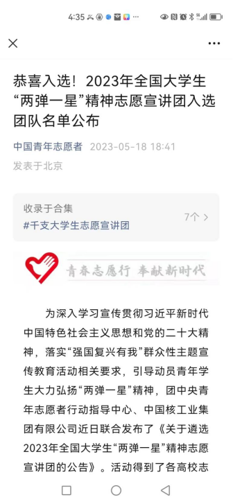 为引导动员青年学生大力弘扬“两弹一星”精神,团中央青年志愿者行动指导中心、中国核工业集团有限公司近日联合发布了《关于遴选2023年全国大学生“两弹一星”精神志愿宣讲团的公告》,共有来自全国637所高校的1438支团队提交了申报材料。