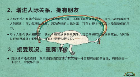 会议初始,主讲人为所有参会人员介绍世界卫生组织关于健康的概念,并提出具体的健康标准。随后,主讲人列举出大量事实证明心理健康与生理健康息息相关,同学们可以通过减低学习、工作上的压力,增进人际关系、拥有朋友,接受现况、重新评价,常存感恩之心,学会放弃一些东西,自我肯定等方法来调节自身的情绪。最后,主讲人要求心理委员能够积极主动的关注班级同学的情况,在自身良好心态的前提下,做好为同学们服务的工作。