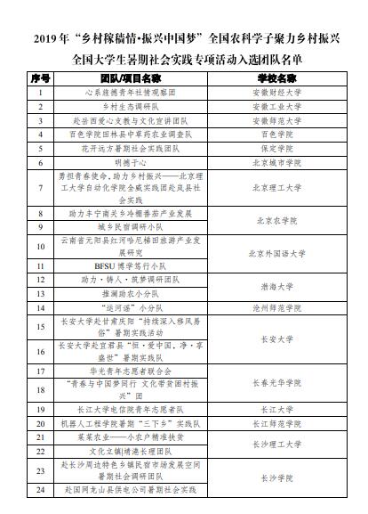 近日,团中央青年发展部、全国农林高校共青团工作联盟、全国高等农业院校大学生服务乡村振兴战略联盟、中国农业大学对在2019年全国大中专学生志愿者暑期文化科技卫生“三下乡”社会实践活动中表现突出的集体进行了通报,我院申报的“赴长沙周边特色乡镇民宿市场发展空间暑期社会调研”团队和“赴国网龙山县供电公司暑期社会实践”团队获批“2019年“乡村稼穑情·振兴中国梦”全国农科学子聚力乡村振兴全国大学生暑期社会实践专项活动”立项。