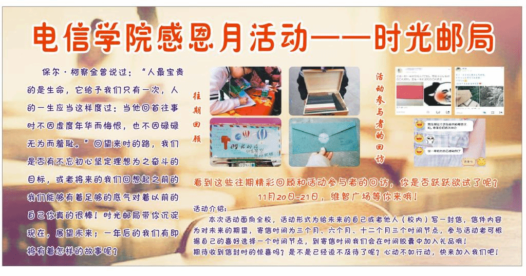 第三届“时光邮局”带大家沉淀现在,展望未来:一年后的我们即将有着怎样的故事呢?电信学院感恩月“时光邮局”活动利用时光的交错,使之增添一丝趣味。在书写的过程中,同学们可以表达自己的想法,诉说自己的理想,确定今后发展的方向与目标。“时光邮局”活动继续沿用前两届活动方式,免费为同学们提供信封、信纸、明信片,并贴上邮票寄出。