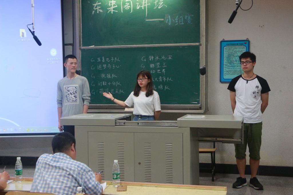 “东来阁讲坛”校级小组赛比赛流程分为三部分,第一部分为各队轮流上台在六十秒内诠释自己的队名,再用十二分钟进行讲演;第二部分为评委投票,投票分为专业评委投票和大众评委投票;第三部分则是由评委代表进行总结和点评。