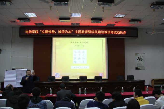 为进一步加强学风建设,引导学生诚信考试,促进学生养成良好的诚信道德品质,电信学院于2017年12月22日下午在致远楼学术报告厅举办 “立德修身,诚信为本”主题教育暨学风建设诚信考试动员会。校关工委副主任李云龙教授,邓名皋教授,电信学院辅导员江艳出席了动员会;近300名电信学子参加了动员会。会议由电信学院党总支副书记胡小毅主持。