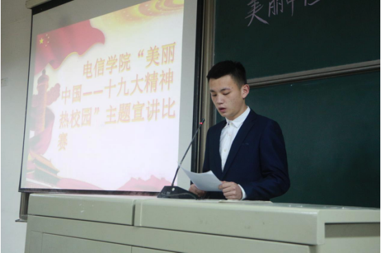 4月16日晚,电信学院组织开展的“美丽中国——十九大精神热校园主题宣讲”活动精彩开讲。学院党总支副书记胡小毅、学工办主任江艳以及辅导员杨然钧担任评委。