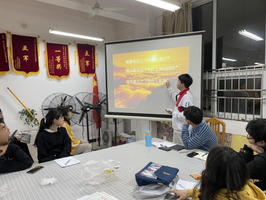 3月29日晚,在理工楼B210学生活动室的电子大屏幕上,一张红军乘风破浪的照片占满了整个荧幕,“1935年的四渡赤水之战,红军取得了战略转移中具有决定意义的胜利。”台上的主讲人正在激情解说。每周的星期一晚间,都有着类似的声音在这个房间里回荡。这是电信学院团总支、学生会开展特色微党课活动。