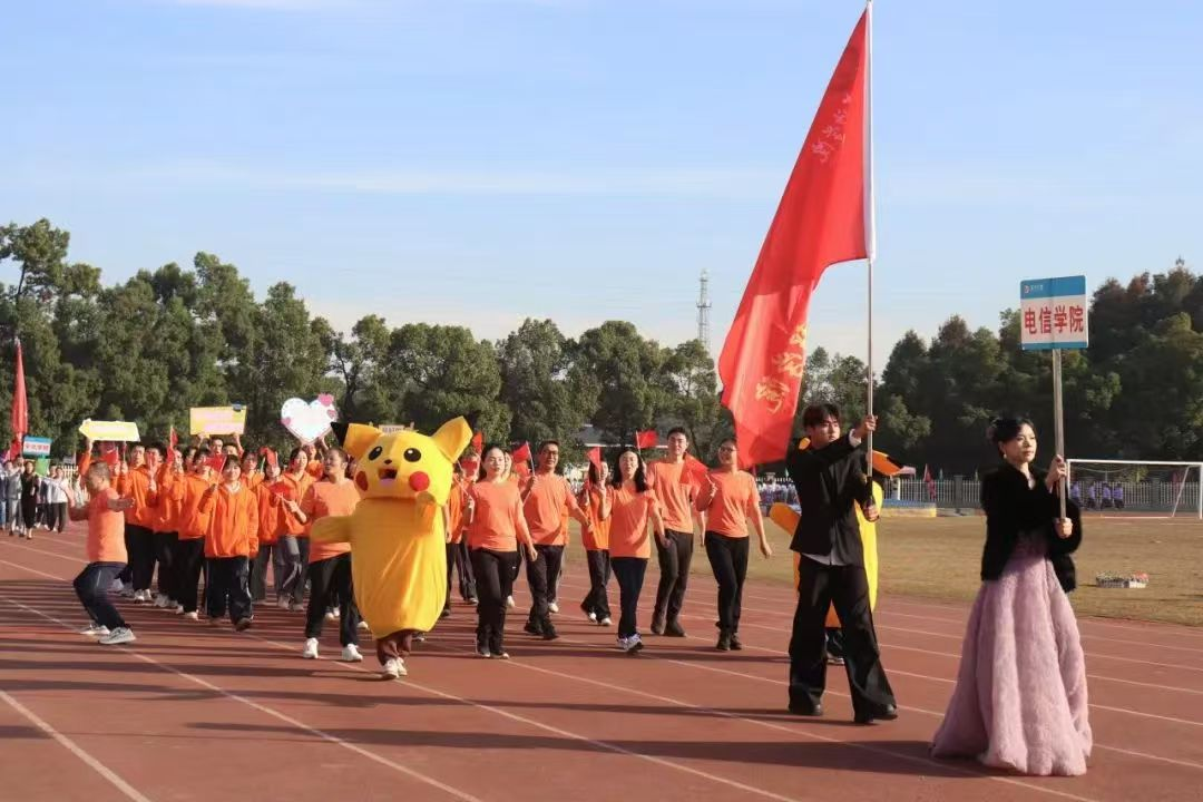 开幕式上,电信学院方阵整齐划一,步伐坚定。电信学子及教师身着统一服装,精神抖擞地走过主席台。他们口号嘹亮,以“电信电信,激流勇进,携手共进,秀出自信”这一学院口号起头,以“逐风破浪,赛出华篇”这一美好祝愿结尾,彰显着青春的活力与自信。方阵间彩旗飘扬,为运动会增添了一抹绚丽的色彩。
