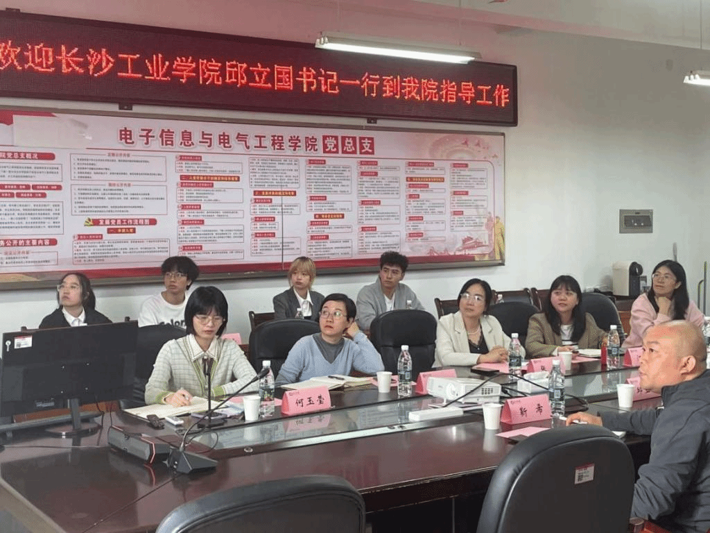 为深化学院间交流合作,共享教育资源与管理经验,11月1日上午,长沙工业学院电子信息工程学院党建负责人邱立国率领调研团队莅临我院,开展了一场富有成效的交流座谈活动。我院党总支书记张丹、党总支副书记江艳、学工办及学生代表热情接待了邱立国一行。