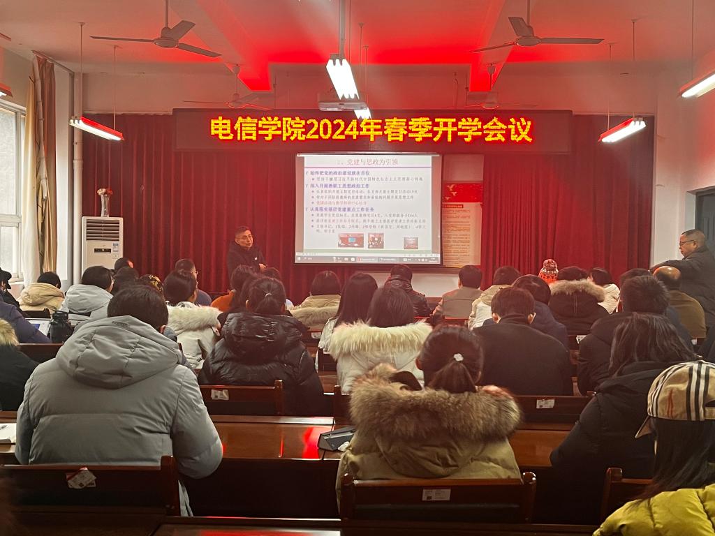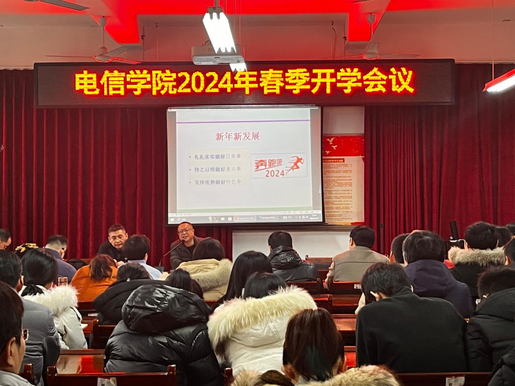 为做好开学工作,明确新学期工作方向,电信学院于2024年2月23日上午9点半在理工楼B211召开2024年春季开学工作会议。会议由党总支书记张志刚主持,院长朱培栋、党总支副书记江艳、副院长刘辉、苏钢出席会议,全体教职员工参加会议。