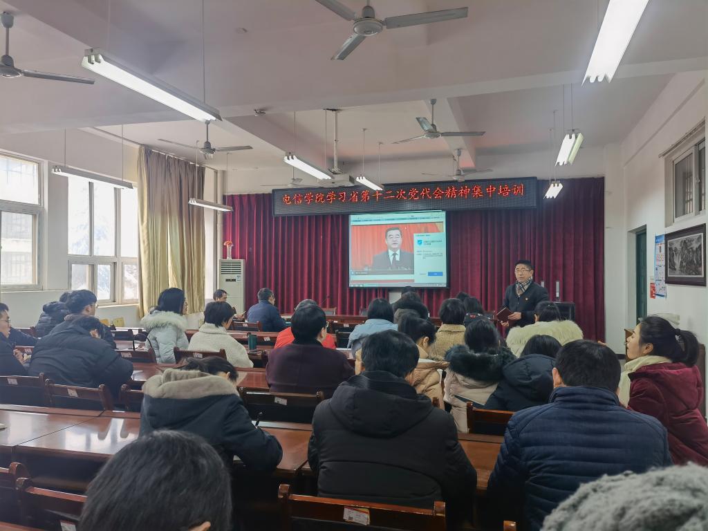 电信学院全体师生党员开展学习贯彻湖南省第十二次党代会精神集 为学习贯彻湖南省第十二次党代会精神,2021年12月27日上午9点到11点半,电信学院党总支组织全体师生党员观看了《奋斗新征程,谱写新篇章》教育片。学习培训由党总支书记张海涛主持。专题教育电视片回顾了湖南省第十二次党代会会议基本情况和内容,介绍了今后五年全省工作的总体要求和经济社会发展的主要目标,并邀请了7名专家学者深度解读省党代会报告、14名省党代表结合工作谈贯彻落实举措。