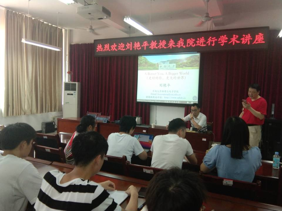 2021年6月9日上午,中南大学物理与电子学院刘艳平教授在理工楼B202会议室为我院师生做了题为“A Better You, A Bigger World(更好的你,更大的世界)”的报告,我院相关专业师生聆听了此次精彩励志的报告。