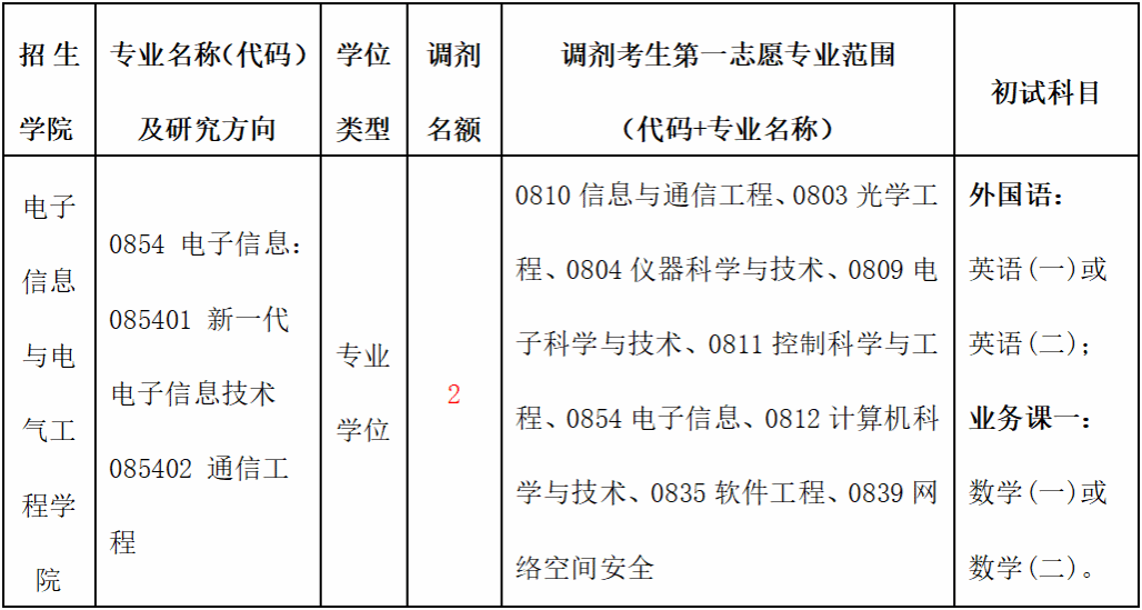 根据我院2026年硕士研究生招生计划及第一志愿考生复试情况,我院电子信息专业(代码:0854)拟接收调剂考生,且仅招收全日制硕士研究生。
