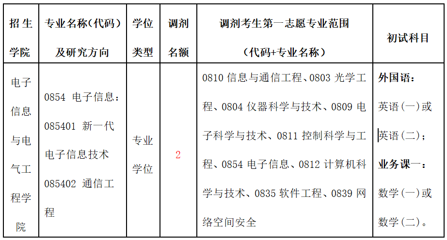 根据我院2026年硕士研究生招生计划及第一志愿考生复试情况,我院电子信息专业(代码:0854)拟接收调剂考生,且仅招收全日制硕士研究生。
